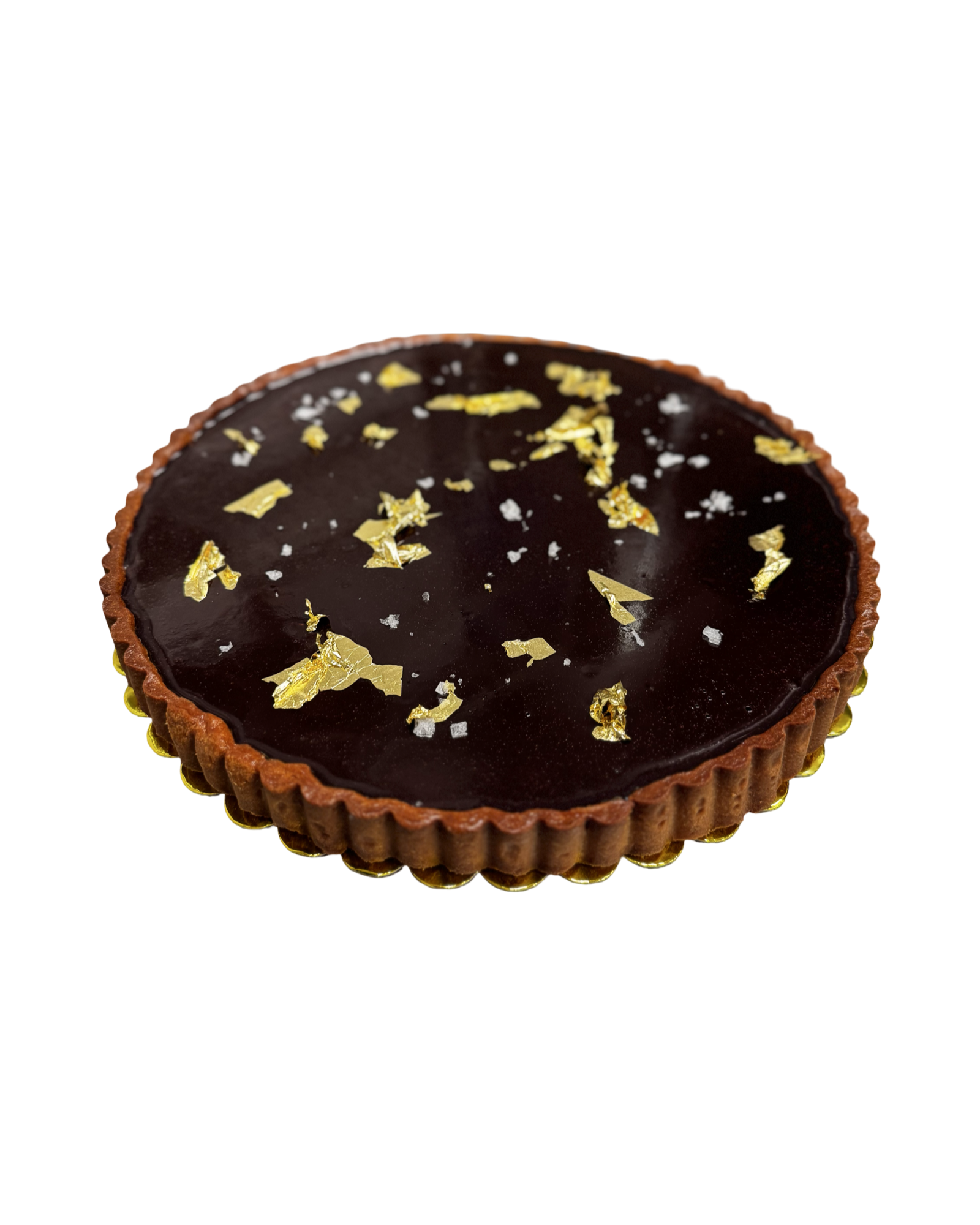 10”, layers of raspberry caramel, chocolate mousse and mirror chocolate glaze, sprinkled with edible gold leaf and sea salt.