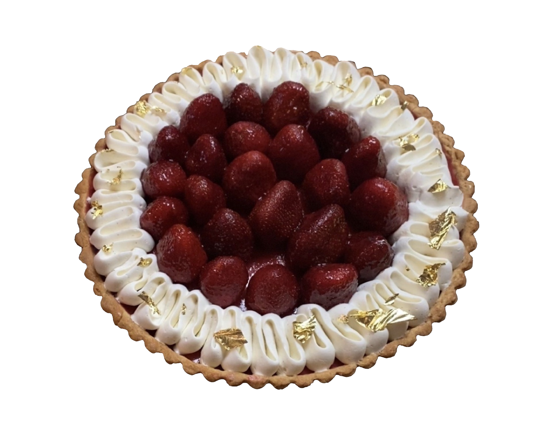 10”, lemon curd topped with strawberries and accented with chantilly cream and edible gold leaf